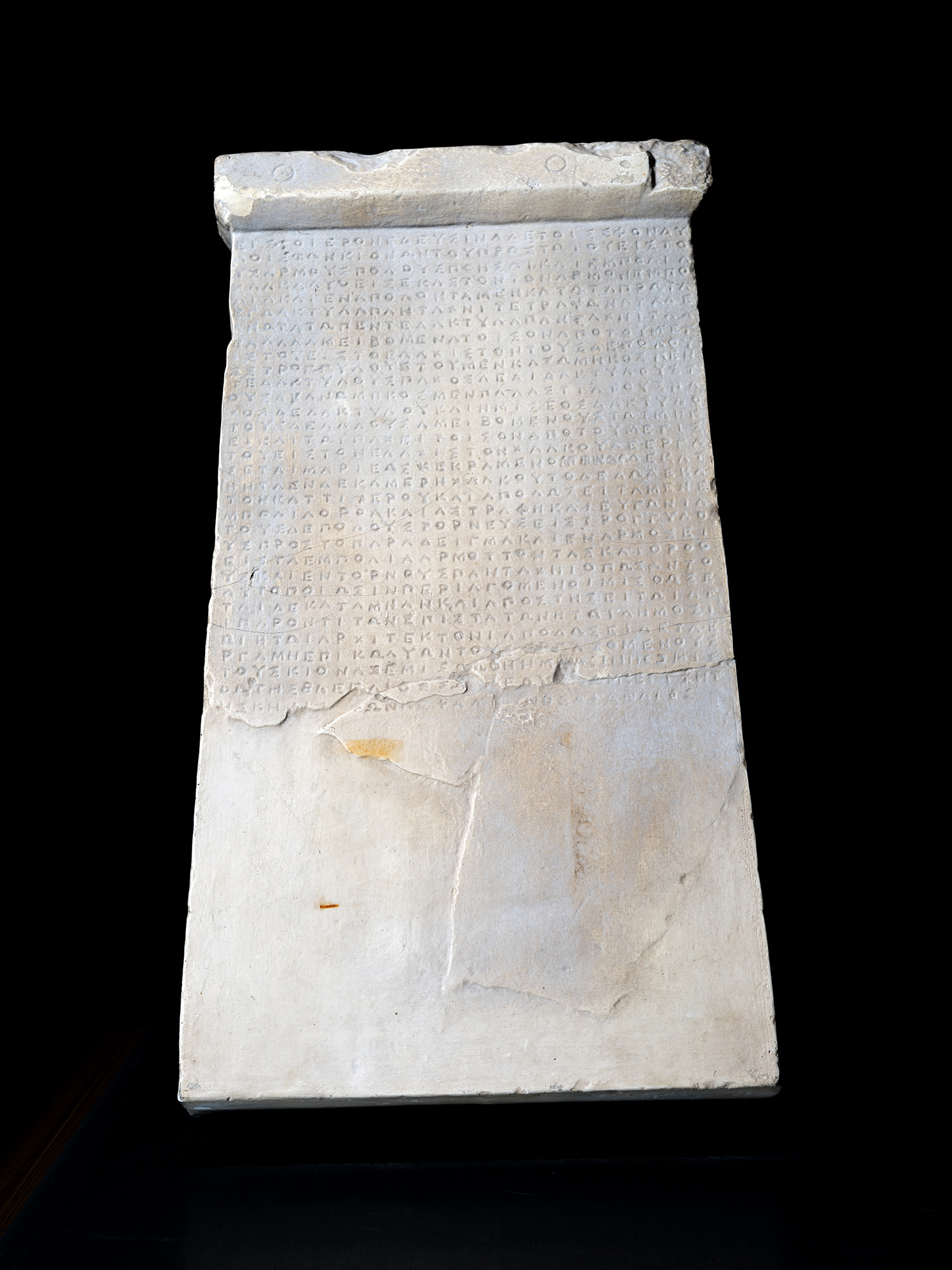 Αντίγραφο ενεπίγραφης στήλης του 4ου αιώνα π.Χ. Το κείμενό της αναφέρεται σε μία παραγγελία για την κατασκευή μπρούτζινων συνδέσμων και περιέχει τεχνικές και χημικές προδιαγραφές για την κατασκευή τους.