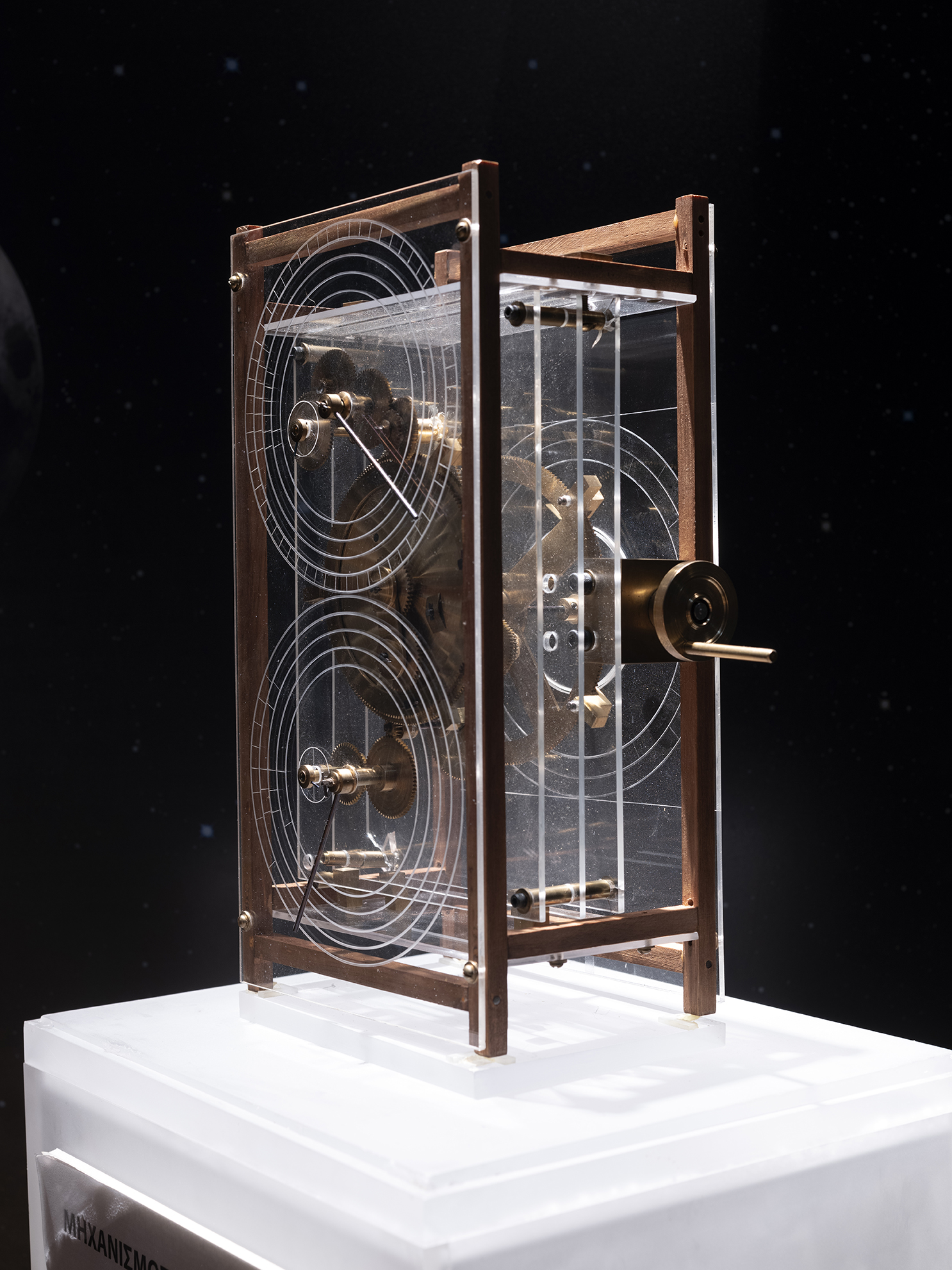 Ομοίωμα ενός από τους πλέον σύνθετους μηχανισμούς που διασώθηκαν από την αρχαία Ελλάδα. Αποτελείται από 32 (τουλάχιστον) γρανάζια, διαφόρων μεγεθών, τα οποία έμπαιναν σε κίνηση ταυτόχρονα από μία χειρολαβή. Ανάμεσά τους περιλαμβάνεται και ένα διαφορικό γρανάζι. Σύμφωνα με τη μελέτη του Derek de Solla Price, ο μηχανισμός χρησιμοποιήθηκε ως αστρονομικό όργανο μεγάλης ακρίβειας. Κατασκευάστηκε περίπου το 80 π.Χ. πιθανότατα στη Ρόδο. Η επιστημονική και ιστορική αξία του οργάνου είναι τεράστια, αφού όμοιό του δεν έχει βρεθεί αλλού.