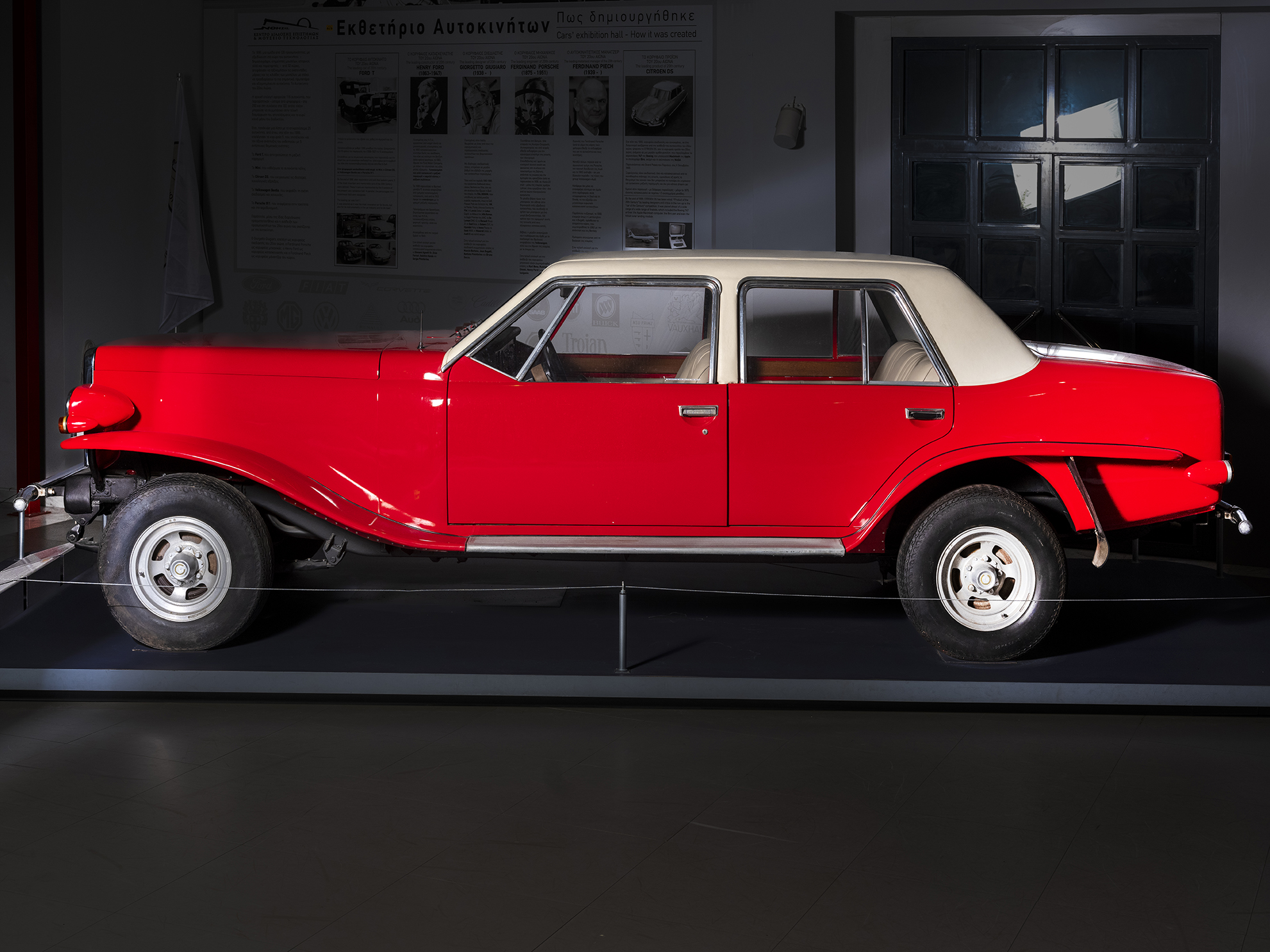Κατασκευάστηκε στο Νεώριο της Σύρου, όταν ιδιοκτήτης των Ναυπηγείων ήταν ο Γιάννης Γουλανδρής. Ο κος Γουλανδρής οραματίστηκε ένα 4-θυρο αυτοκίνητο με κίνηση στους 4 τροχούς και εμφάνιση που να παραπέμπει στη δεκαετία 1920/1930. Το σχεδιασμό και συντονισμό της κατασκευής ανέλαβε ο αρχιτέκτονας / σχεδιαστής Γιώργος Μιχαήλ. Το υλικό που κυριαρχεί στην κατασκευή του είναι το αλουμίνιο. Εκτός από το διαφορικό, το σασμάν και τον κινητήρα, το υπόλοιπο αυτοκίνητο είναι χειροποίητο. Τελικά ολοκληρώθηκαν 2 αυτοκίνητα. Το συγκεκριμένο της συλλογής του Νόησις, παραχωρήθηκε από τον ΟΔΔΥ και αποκαταστάθηκε από την Ομοσπονδία Επισκευαστών Αυτοκινήτων και Μηχανημάτων Βορείου Ελλάδος. Το δεύτερο αγνοείται.