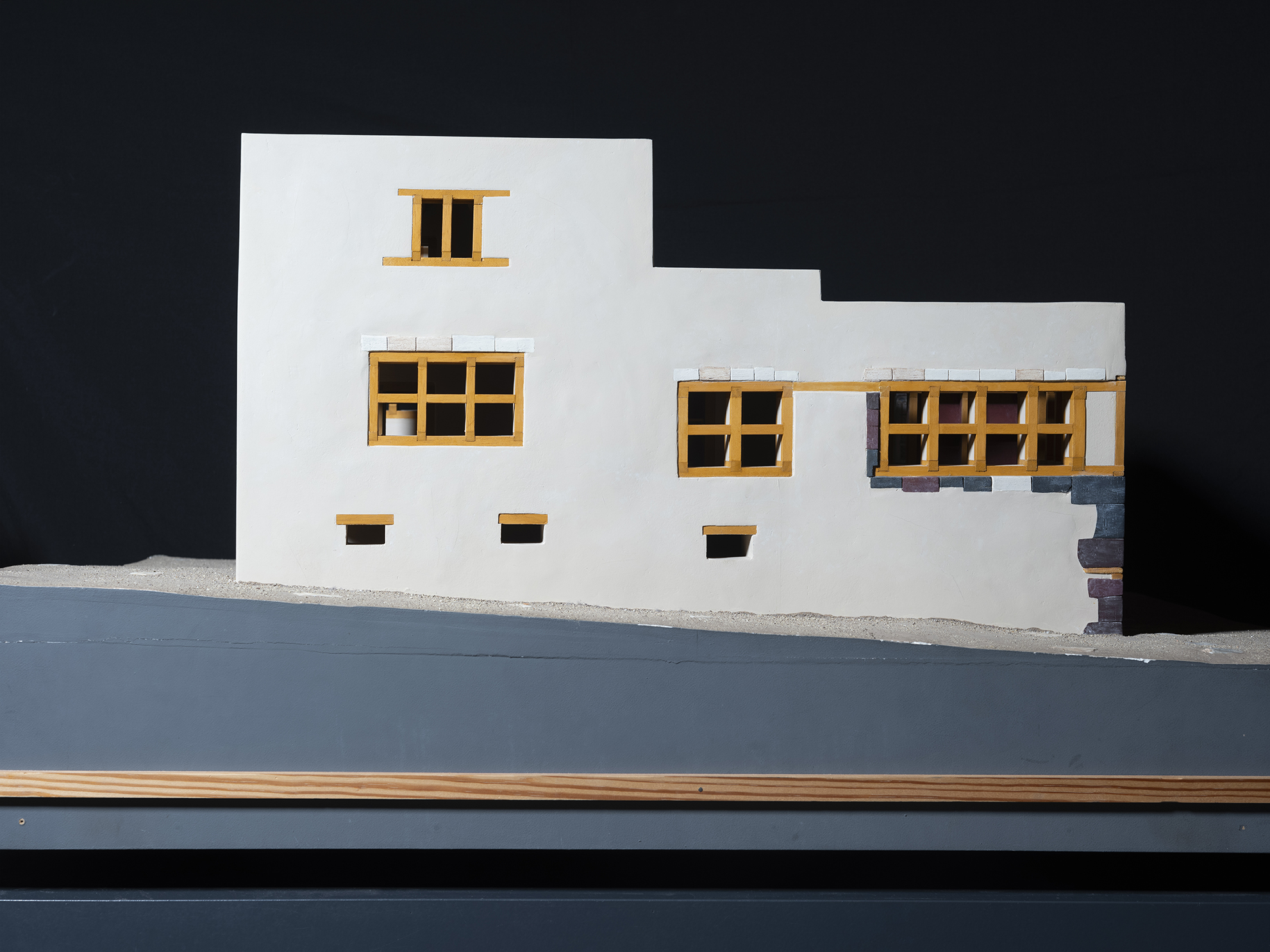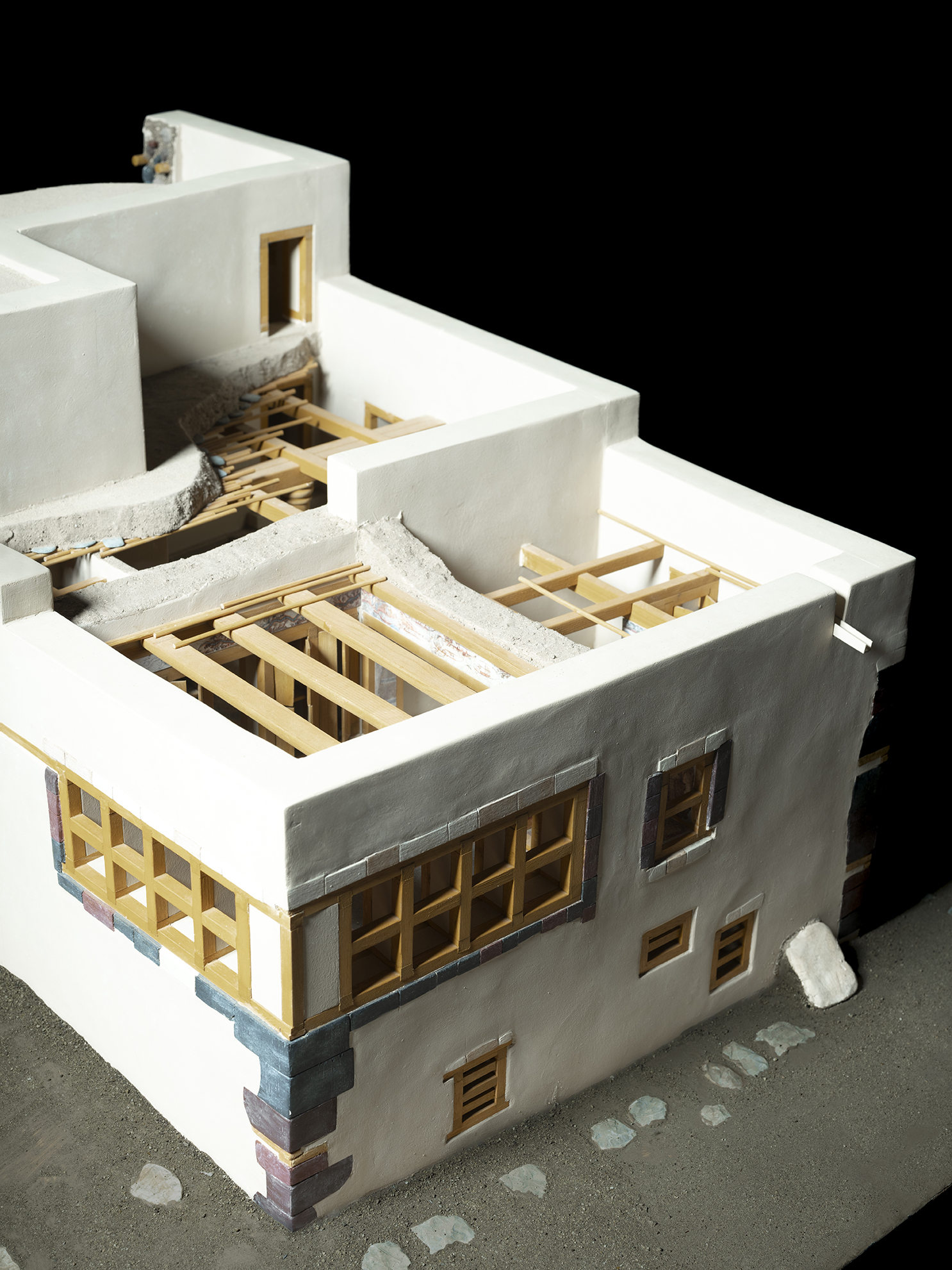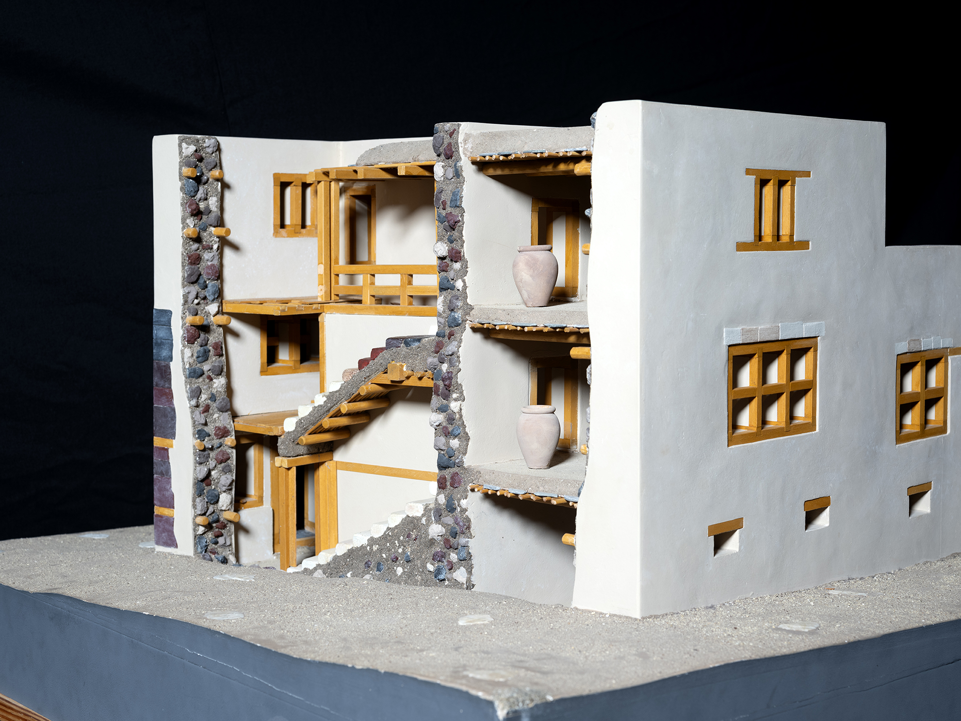 Στο Ακρωτήρι της Θήρας ανασκάπτεται μια εντυπωσιακά διατηρημένη πόλη της Ύστερης Εποχής του Χαλκού (16ος αιώνας π.Χ.). Χάρη στις στάχτες του ηφαιστείου που κάλυψαν τα ερείπια του οικισμού, σώθηκαν σχεδόν ανέπαφα διώροφα και τριώροφα κτήρια. Στο ομοίωμα της λεγόμενης Δυτικής Οικίας - ενός τυπικού σπιτιού της πλούσιας αυτής πόλης - διακρίνονται πολλές από τις οικοδομικές τεχνικές της εποχής εκείνης: ο τρόπος κατασκευής του δαπέδου και του κλιμακοστασίου, τα περίτεχνα ξύλινα πλαίσια των ανοιγμάτων - που λειτουργούσαν ως φέροντα στοιχεία της οικοδομής, οι λαξευτοί γωνιόλιθοι και τα λαξευτά πλαίσια των παραθύρων με τα έντονα χρώματα των ηφαιστειακών λίθων. Ορισμένα δωμάτια του άνω ορόφου έφεραν τοιχογραφίες (μία εξ αυτών απεικονίζει νηοπομπή) που αποκαλύπτουν στοιχεία της καθημερινής ζωής. Στον όροφο βρέθηκε εγκατάσταση υγιεινής.