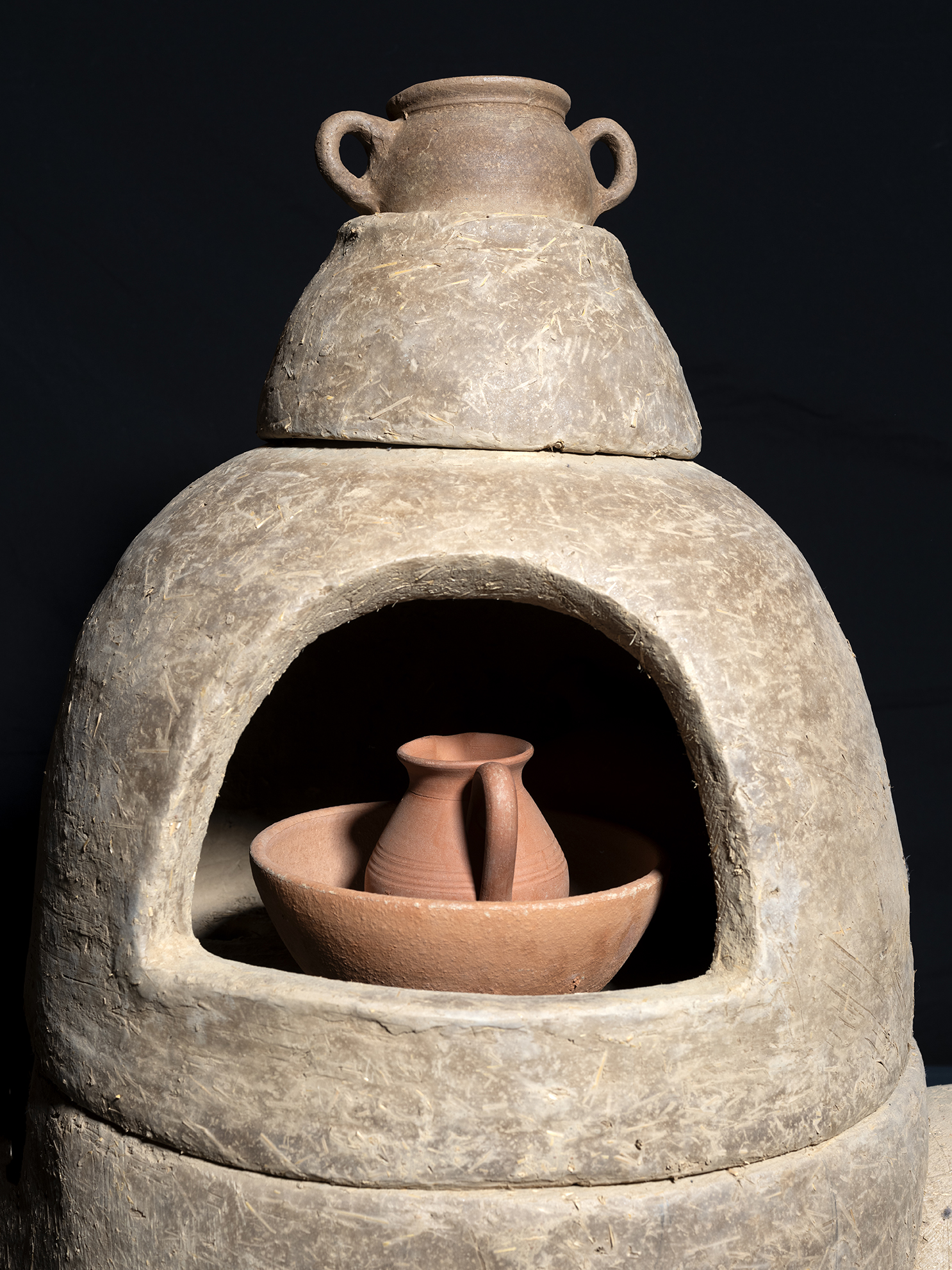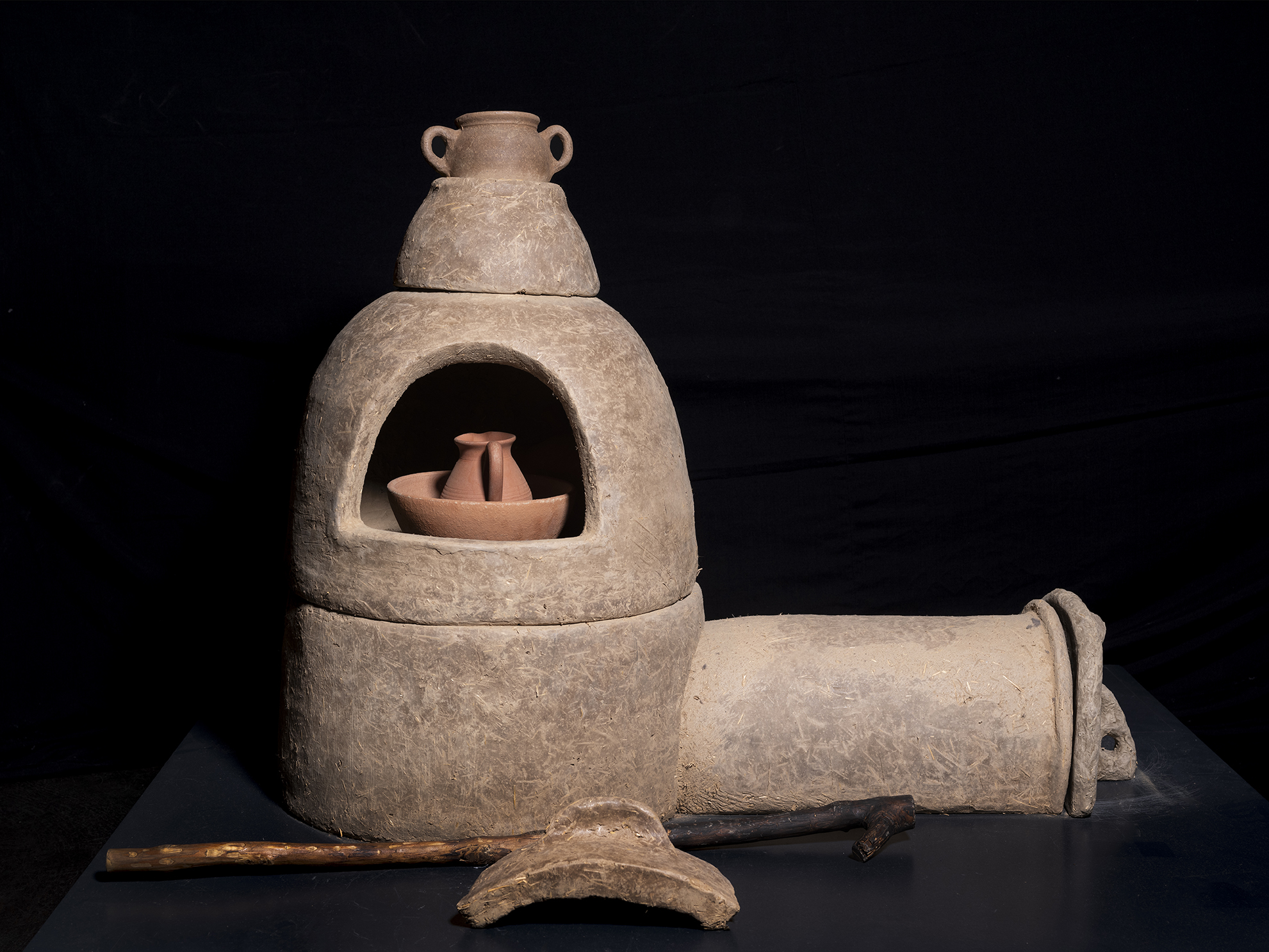 Προσομοίωμα αρχαίου Κορινθιακού σφαιρικού καμινιού του 6ου π.Χ. αι. Κατασκευάστηκε με όμοια υλικά και τεχνικές με το αρχαίο. Είναι πειραματικής λειτουργίας για θερμοκρασία ως 950 βαθμούς Κελσίου. Αν και τα καμίνια στην αρχαιότητα ήταν ενιαία, το συγκεκριμένο έχει κατασκευαστεί σε 3 μέρη (είσοδος τροφοδοσίας -μπούκα, χώρος καύσης, χώρος όπτισης -ψησίματος- πήλινων αγγείων και ειδών) ώστε να υπάρχει δυνατότητα μεταφοράς για εκπαιδευτικούς λόγους. Για τον ίδιο λόγο τα τοιχώματα έχουν πάχος το 1/10 του κανονικού. Τα λειτουργικά του μέρη είναι: α) το κλείστρο της εισόδου τροφοδοσίας για τον έλεγχο της καύσης β) η είσοδος τροφοδοσίας για την καύσιμη ύλη (ξύλα), γ) η μπούκα είναι ο χώρος ανάμματος φωτιάς για την προθέρμανση του καμινιού δ) ο χώρος καύσης για τη δραστική άνοδο της θερμοκρασίας ε) τα φανούρια δηλ κυκλικά ανοίγματα για τη μεταφορά της θερμοκρασίας στο χώρο ψησίματος, στ) ο χώρος ψησίματος ζ) η καπνοδόχος η) το αγγείο για μείωση καυσαερίων ι) ξύλινη ράβδος για τον έλεγχο της φωτιά