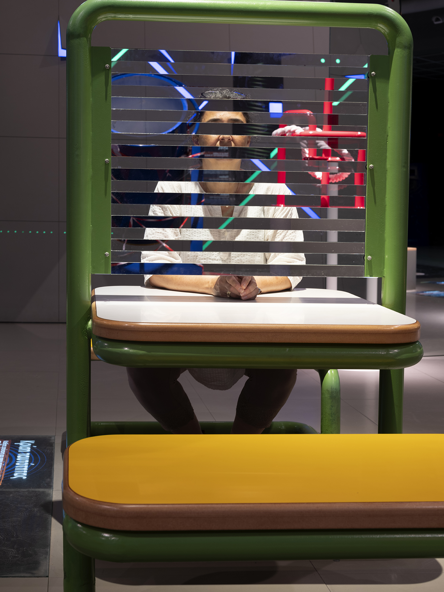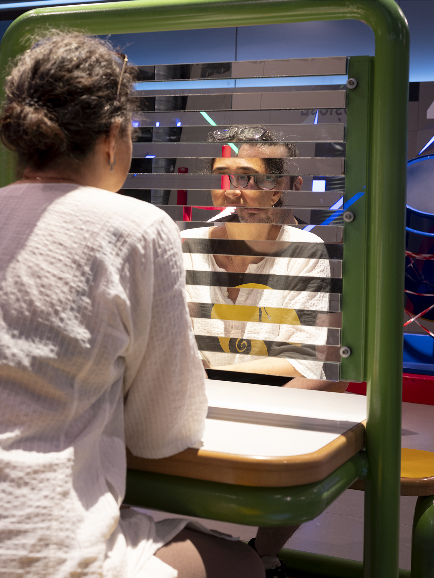 Το έκθεμα αποτελείται από πολλούς καθρέφτες διπλής όψης, οι οποίοι είναι κομμένοι σε στενές λωρίδες και ανάμεσα τους μεσολαβούν κενά ίσου πλάτους με τους καθρέφτες. Όταν δυο επισκέπτες καθίσουν εκατέρωθεν των καθρεφτών, βλέπουν ένα πρόσωπο που είναι η σύνθεση τμημάτων του δικού τους προσώπου και του απέναντι τους.