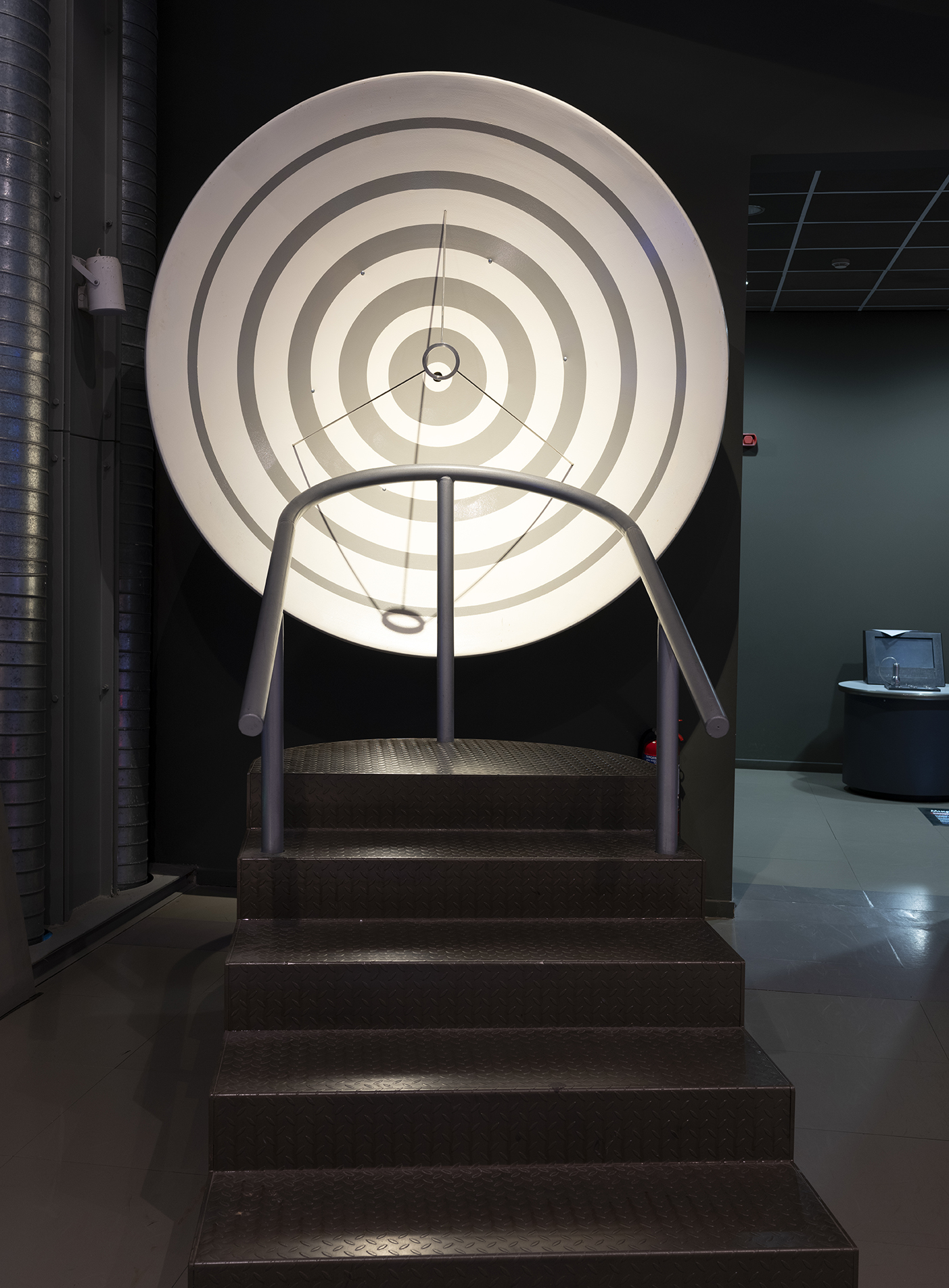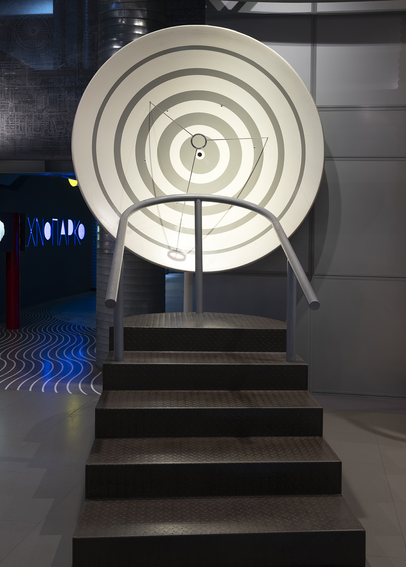 Η διάταξη αποτελείται από δύο παραβολικά κάτοπτρα, τα οποία έχουν τη δυνατότητα να ανακλούν τα κύματα (ηχητικά ή άλλα) με έναν ειδικό τρόπο. Έτσι αν ο επισκέπτης σταθεί στην εστία του ενός κατόπτρου και μιλήσει προς αυτό, η φωνή του θα ανακλαστεί από τον δίσκο του κατόπτρου, θα σχηματίσει μια παράλληλη δέσμη, η οποία με τη σειρά της θα ανακλαστεί στο απέναντι κάτοπτρο και αφού συγκεντρωθεί στην εστία του θα είναι δυνατό ακούσουμε τη φωνή από μακριά.