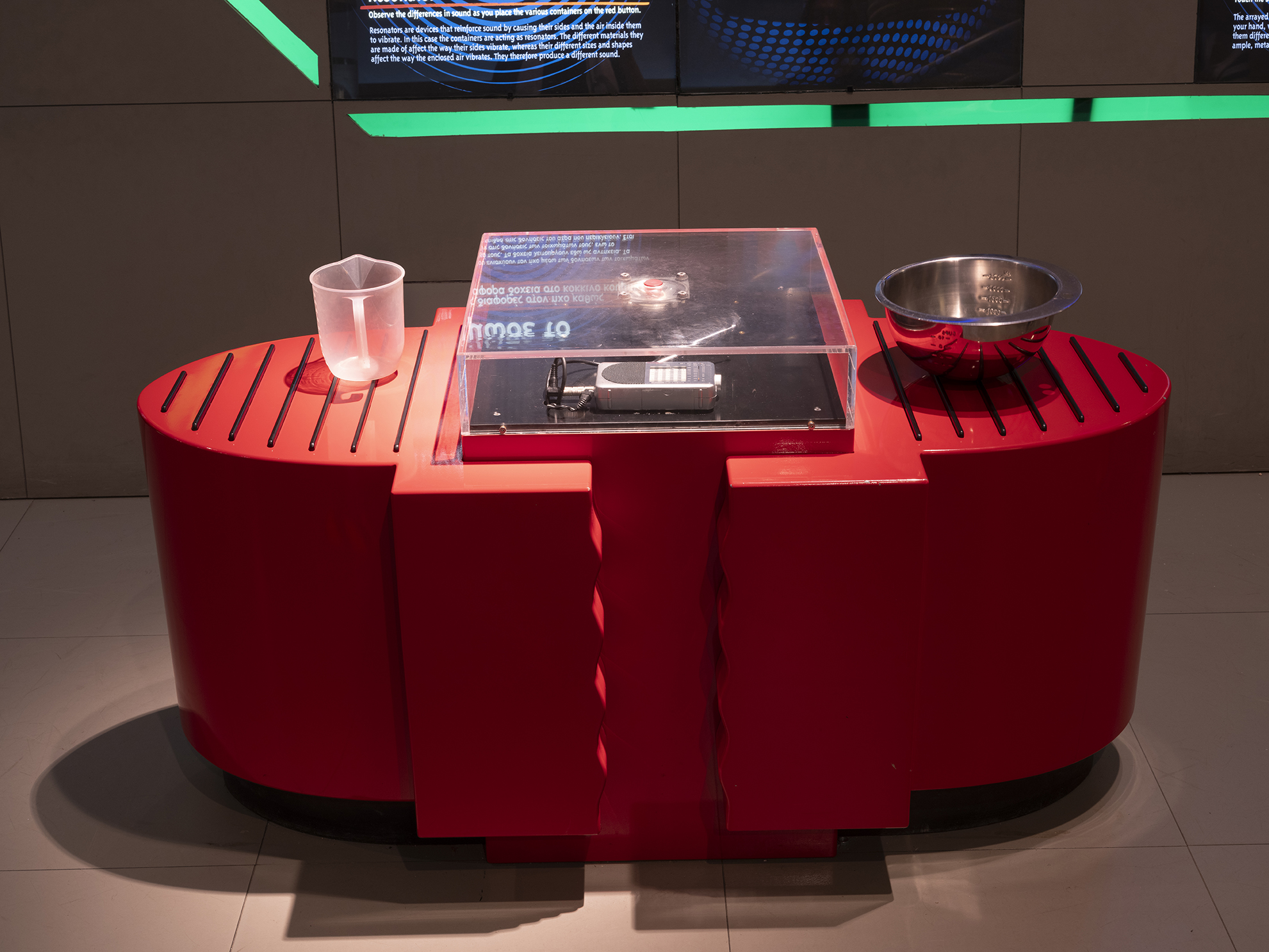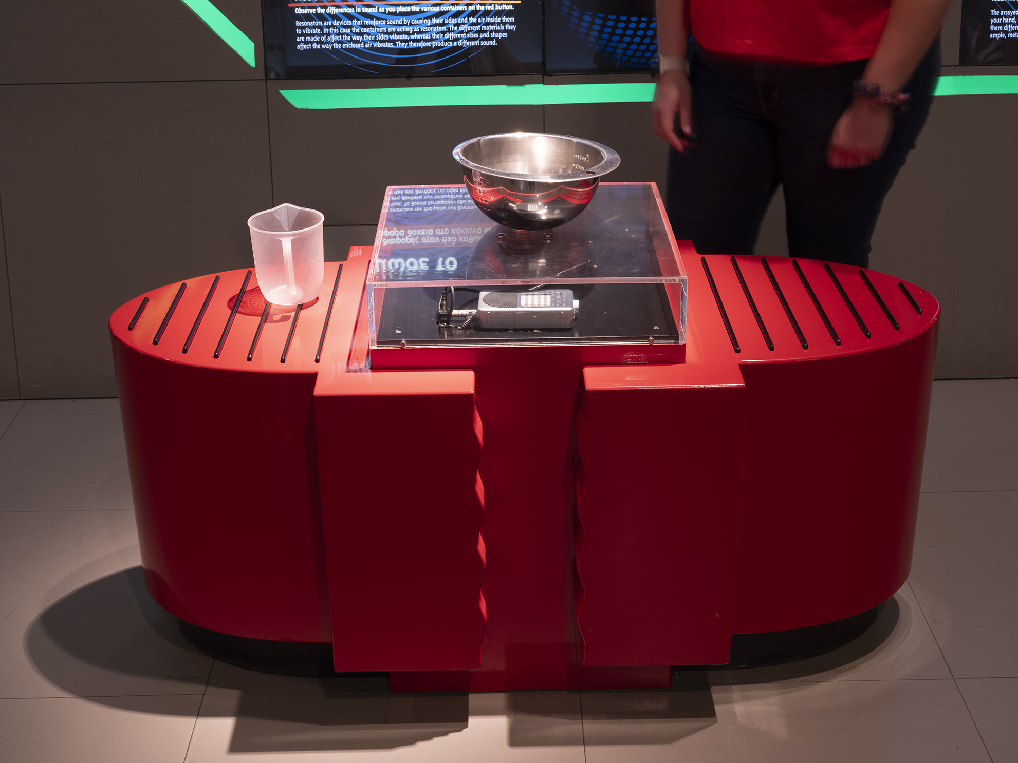 Ένα ηχείο ραδιοφώνου, που του έχει αφαιρεθεί ο κώνος (αντηχείο), είναι συνδεδεμένο με ένα εν λειτουργία ραδιόφωνο. Ενώ αρχικά δεν ακούγεται τίποτε, αν ο χρήστης τοποθετήσει επάνω στον δονούμενο πυρήνα του ηχείου ένα μεταλλικό σκεύος ή έναν πλαστικό κουβά, ο ήχος ακούγεται καθαρά και μάλιστα επηρεασμένος από τις ιδιότητες του κάθε υλικού.