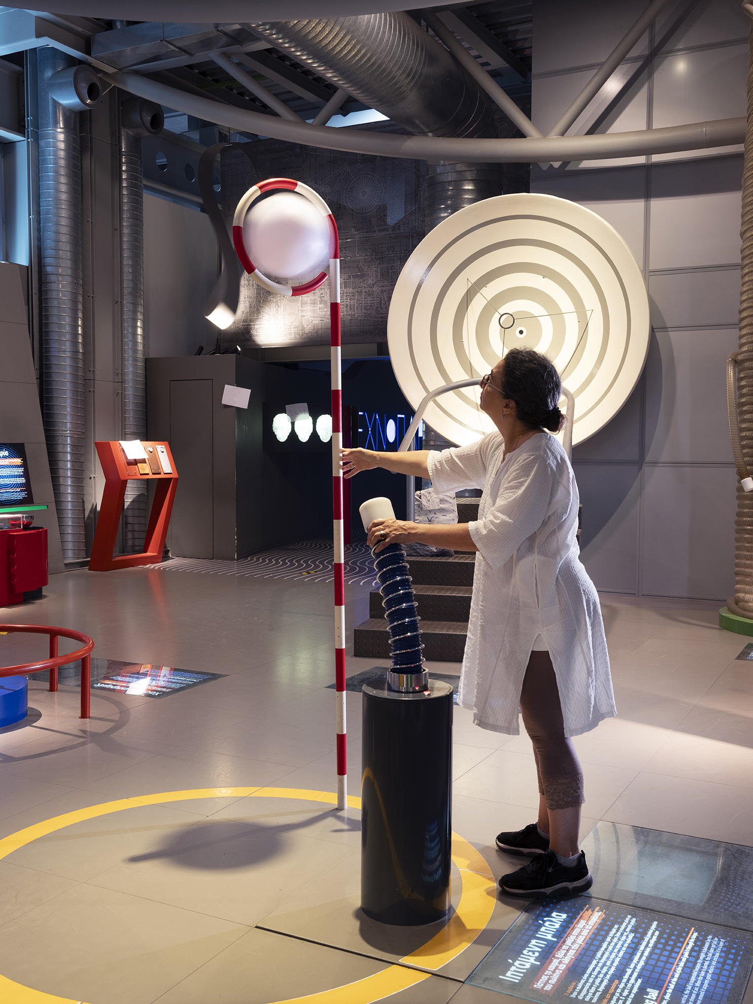 Το έκθεμα αποτελείται από μια συσκευή που δημιουργεί ροή αέρα μεγάλης ταχύτητας που διαφεύγει μέσω ενός σωλήνα. Ο επισκέπτης τοποθετώντας μια ελαφριά μπάλα στο σωλήνα θα διαπιστώσει ότι η μπάλα αρχίζει να αιωρείται καθώς η ροή του αέρα αντισταθμίζει το βάρος της μπάλας. Το εντυπωσιακό είναι ότι και μετά την στρέψη του ακροφυσίου και την εκτροπή της μπάλας από την κατακόρυφη διεύθυνση, αυτή εξακολουθεί να αιωρείται στη νέα πλάγια θέση.