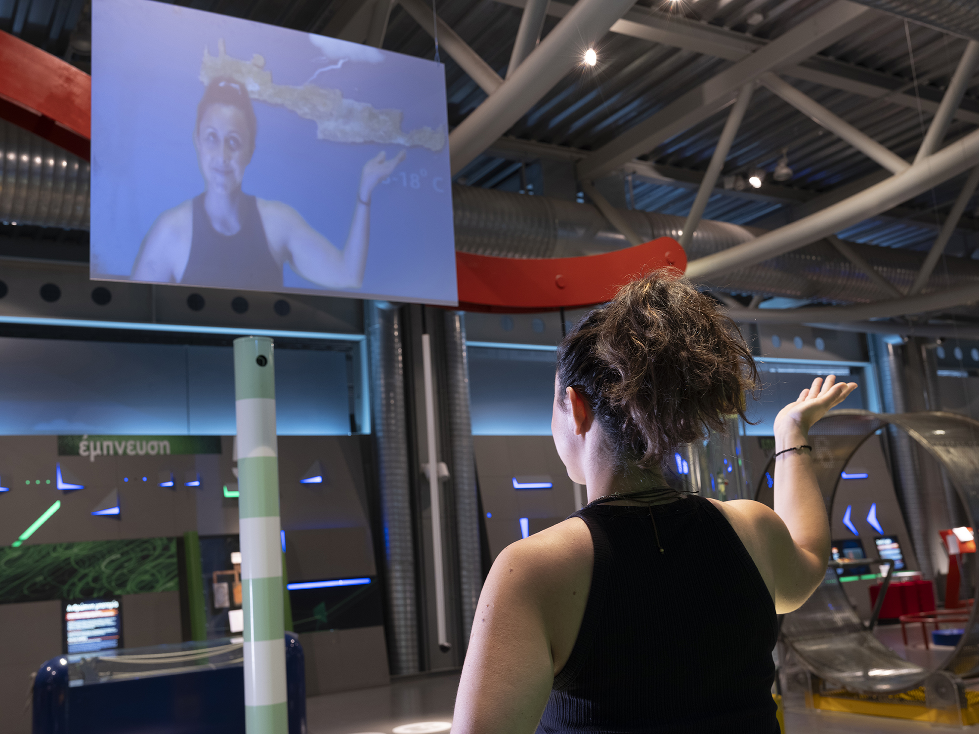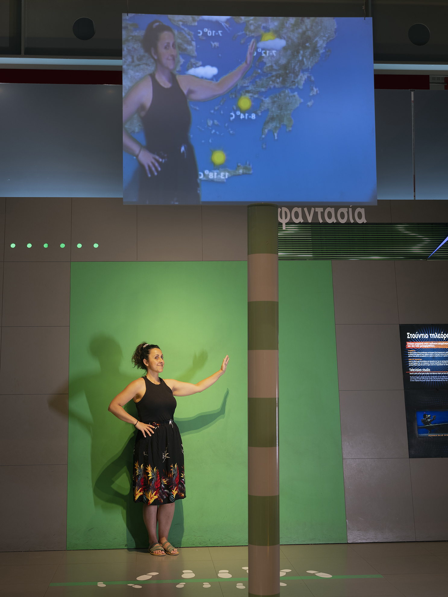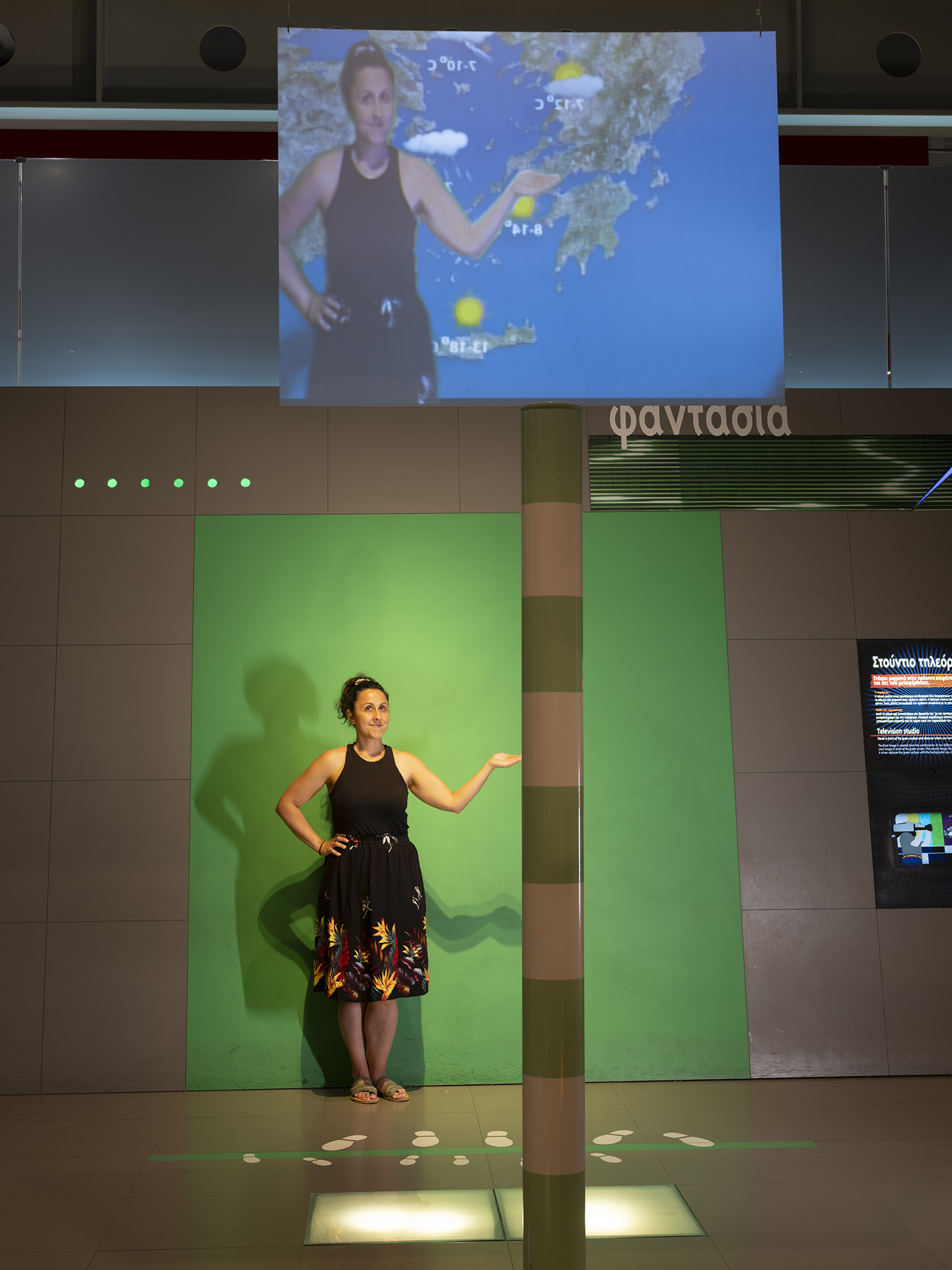 Το έκθεμα αποτελείται από μια κάμερα, έναν μίκτη βίντεο και ένα προβολέα. Ο επισκέπτης στέκεται μπροστά σε ένα πράσινο "υπόβαθρο" - ένα τοίχο βαμμένο πράσινο. Η κάμερα τον βιντεοσκοπεί, και στη συνέχεια το σήμα περνάει στον μίκτη. Ο μίκτης προσθέτει ένα δεύτερο βίντεο -με διαδραστικό χάρτη του καιρού- και στο αρχικό βίντεο γίνεται διαφανές οτιδήποτε είχε πράσινο χρώμα. Έτσι στα σημεία που εμφανιζόταν το πράσινο χρώμα του υπόβαθρου εμφανίζεται το δεύτερο βίντεο με τους χάρτες του καιρού. Το τελικό βίντεο που προβάλλεται από τον προβολέα είναι ο επισκέπτης μπροστά στους χάρτες του καιρού