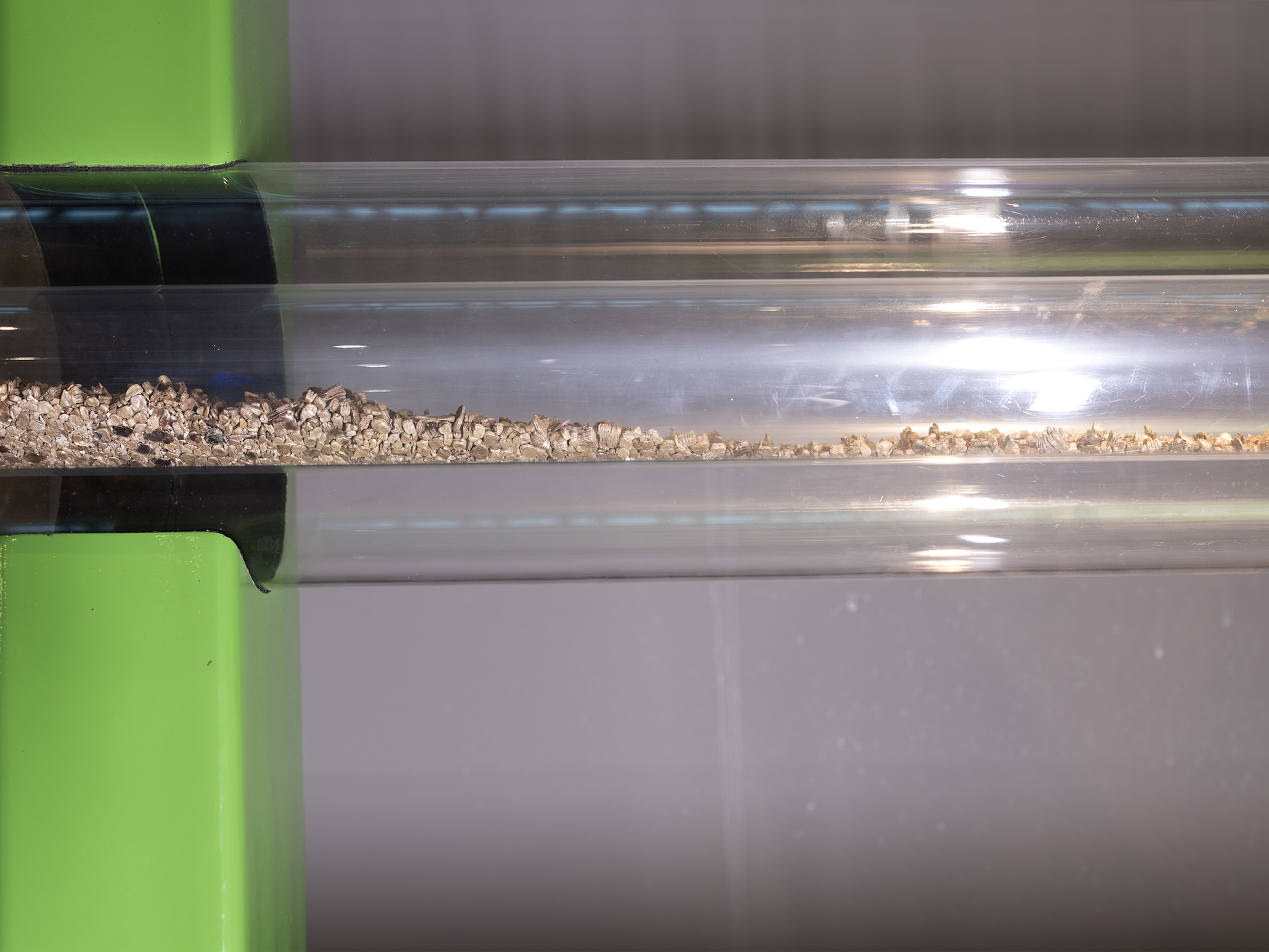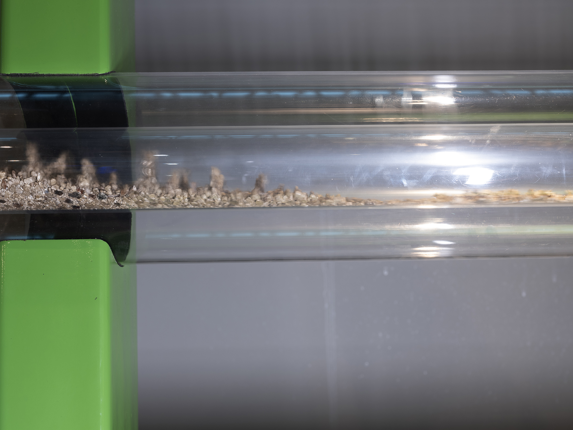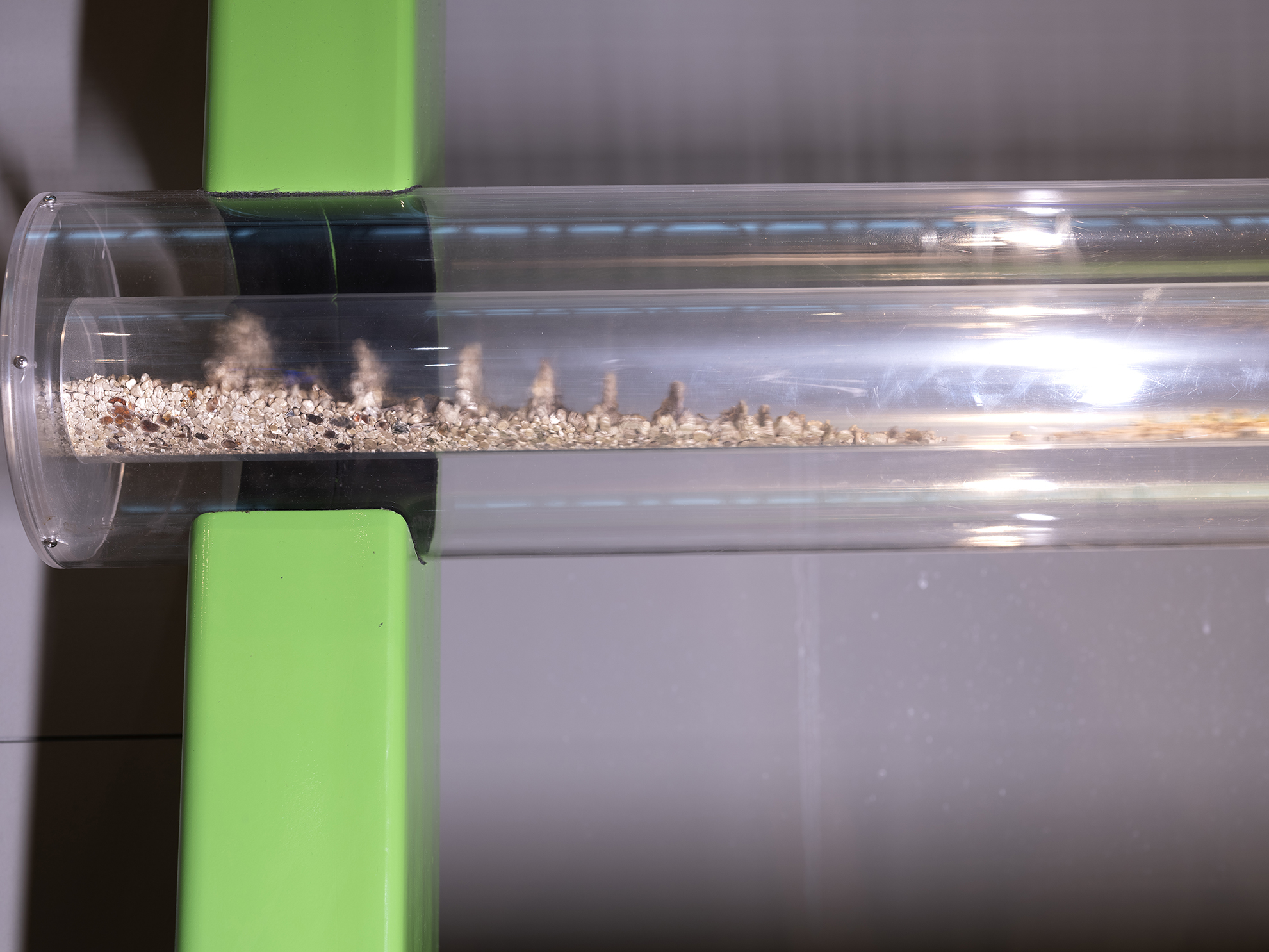Ένας οριζόντιος σωλήνας από διάφανο πλέξιγλας περιέχει μικρά κομμάτια φελιζόλ. Στην άκρη του είναι προσαρμοσμένο ένα ηχείο. Ο επισκέπτης ρυθμίζει τη συχνότητα του ήχου που παράγεται. Ο αέρας στο εσωτερικό του σωλήνα τίθεται σε κίνηση λόγω της διάδοσης του ηχητικού κύματος. Μάλιστα τα μόρια του αέρα κάνουν διαμήκη αρμονική ταλάντωση. Κατά την κίνηση τους παρασύρουν τα μικρά κομμάτια φελιζόλ, οπότε σχηματίζεται η εικόνα του κύματος. Στην πραγματικότητα σχηματίζονται στάσιμα κύματα και φαίνονται οι κοιλίες και οι δεσμοί. Μεταβάλλοντας τη συχνότητα, μεταβάλλονται και οι θέσεις των δεσμών και των κοιλιών.